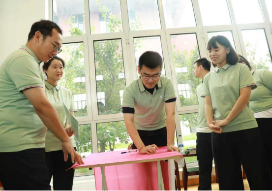 活动以“团队破冰”环节温情启幕。25组家庭划分为3支队伍。在我校拓展教师的引导下,民警与家属围坐一堂,共同为队伍构思名字,绘制队徽。大家充分发挥创意,巧妙融入五角星等具有象征意义的元素,把对家人的心意与团队的认同转化为笔下的线条与色彩,使其成为传递家庭情感、凝聚团队力量的载体。随后,所有人手拉手围成大圈,伴着《兔子舞》的欢快旋律同步跳跃,七夕的浪漫与团队的温情,在轻松的互动里慢慢漾开。